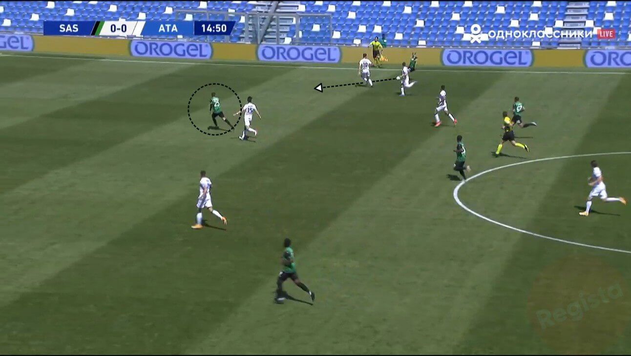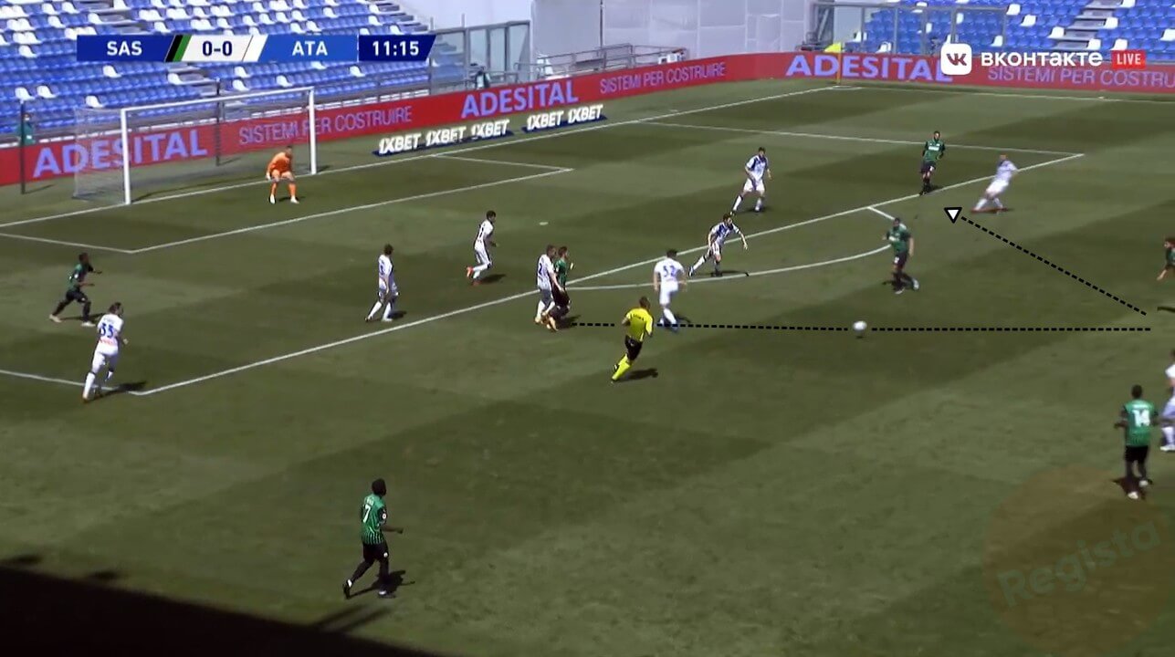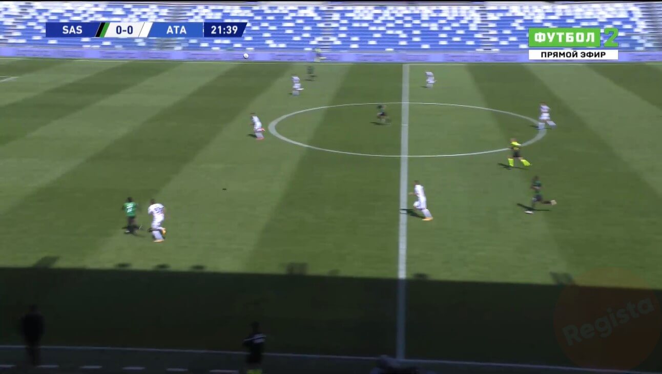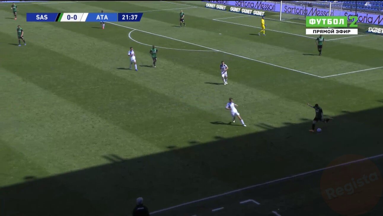 И всё же отрезок в начале встречи дал возможность хозяевам почувствовать связи на чужой половине и понять, как можно использовать пространство перед штрафной соперника. Во многом, именно это позволило резко ускориться в ходе именно позиционной атаки и найти брешь в обороне соперника, несмотря на то, что позиционное наступление «Сассуоло» наладить, по сути, не удавалось, а бергамаски очень неплохо перекрывали все зоны как на подступах к своей штрафной, так и на входе в финальную треть.
