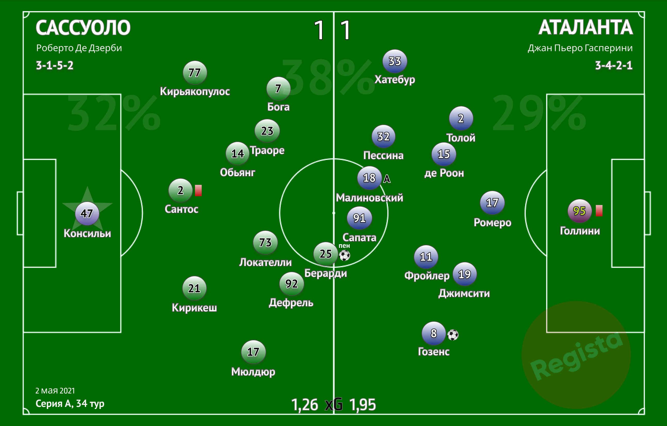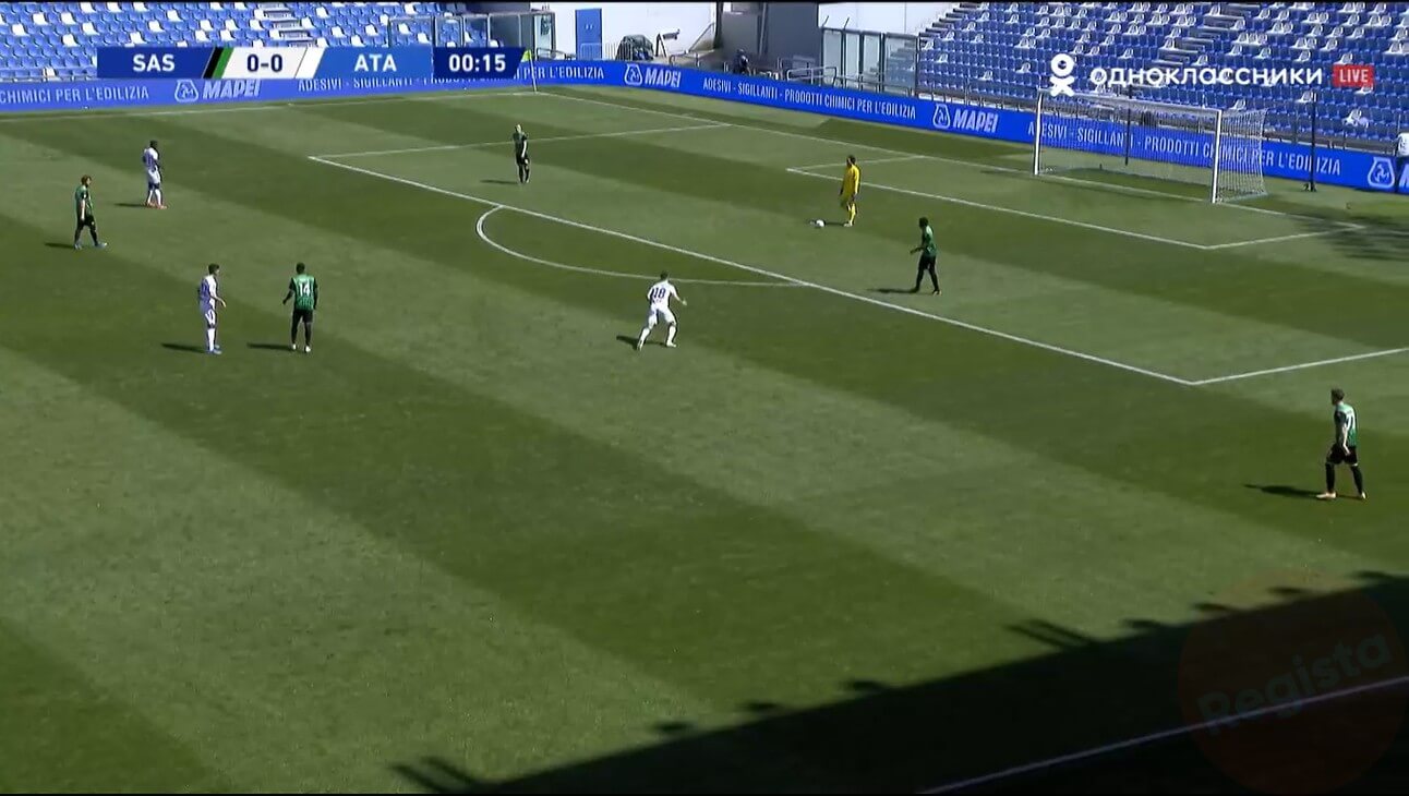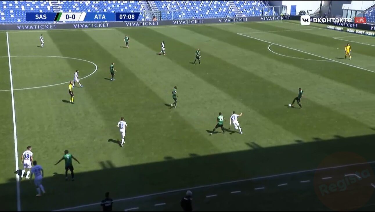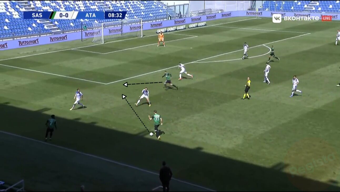 И всё же отрезок в начале встречи дал возможность хозяевам почувствовать связи на чужой половине и понять, как можно использовать пространство перед штрафной соперника. Во многом, именно это позволило резко ускориться в ходе именно позиционной атаки и найти брешь в обороне соперника, несмотря на то, что позиционное наступление «Сассуоло» наладить, по сути, не удавалось, а бергамаски очень неплохо перекрывали все зоны как на подступах к своей штрафной, так и на входе в финальную треть.